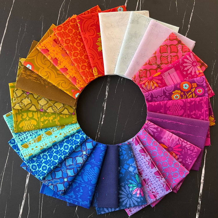 La cour centrale est surnaturelle. Les plantes changent au fil des saisons et lors de notre première visite en octobre, les chrysanthèmes aux couleurs automnales étaient en fleurs. Formée à l'aide d'une technique japonaise appelée okigu, la cour regorgeait de gigantesques fleurs simples perchées sur des tiges de plus de quatre pieds de haut. Je suis ravie de partager avec vous « Chrysanthème », mon interprétation des textures d'Isabella rendues sous forme de tissu.