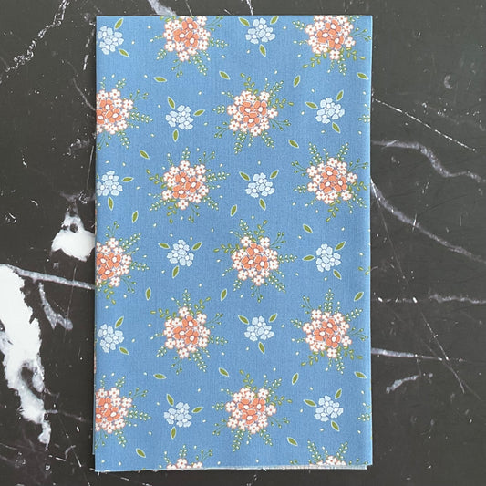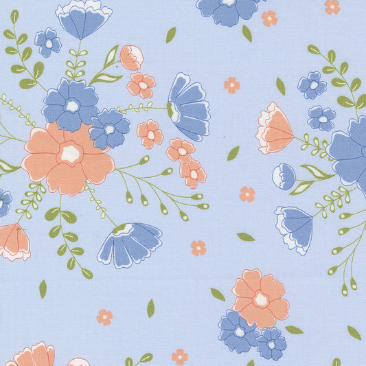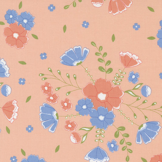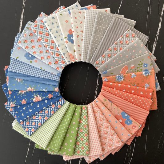 "J'ai une ligne de tissus bleu cobalt et corail en tête depuis plusieurs années. J'ai imaginé de jolies fleurs, de jolis vichy, de délicats imprimés calicot, des pois, des vichy et des rayures, le tout dispersé sur des fonds dans des tons de bleu, de corail et pêche. Je pourrais simplement imaginer ajouter un beau vert et un de mes gris emblématiques pour compléter la palette de couleurs. Maintenant, j'ai donné vie à cette collection et j'espère que vous l'aimerez autant que moi. Je suis si fière de je vous présente Peachy Keen ! » -Corey