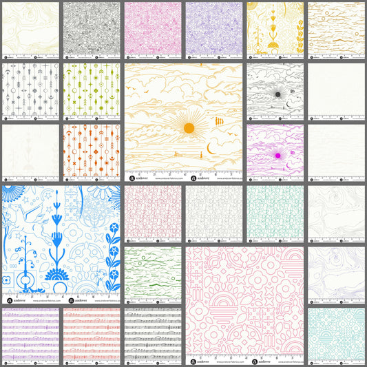 Similar in spirit to Sun Print Luminance, but this time the design is entirely line work and motifs on a creamy white background—perfect for scrappy backgrounds or used individually as unique, dynamic neutrals. The spectrum of colorful line work on white backgrounds in Luminance was a longtime favorite, and I’m thrilled to now expand on that concept.