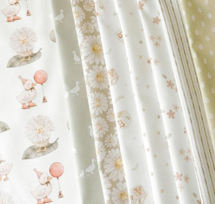 Soft and whimsical, Tiny Waddles is a charming fabric collection designed for little ones, featuring a soothing palette of warm neutrals. At its heart, playful ducklings embark on tiny adventures, complemented by delicate florals, hand-drawn ducks, soft polka dots, and classic stripes. Thoughtfully crafted with a nostalgic, storybook feel, this collection brings warmth and charm to children's clothing, bedding, and decor.