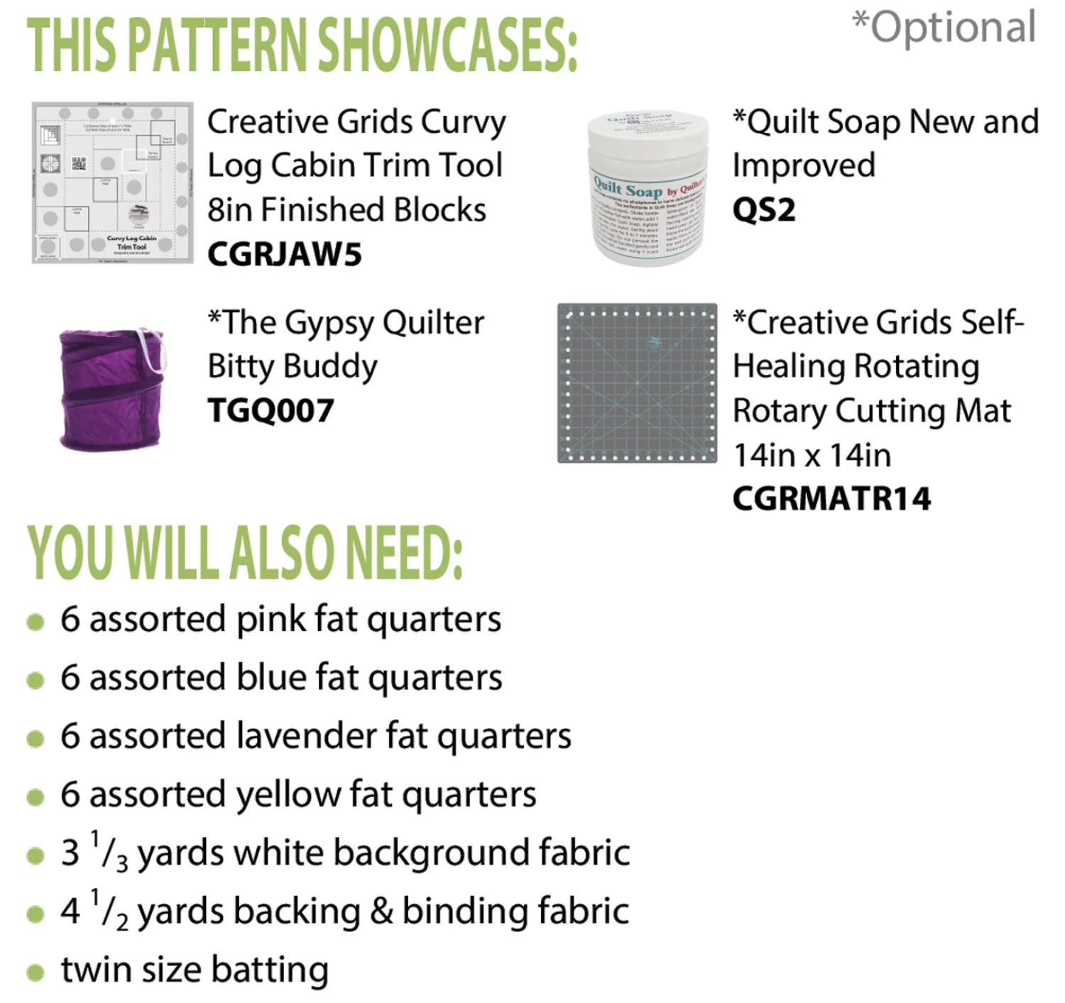 Bubbles is beautiful in pastels – just 6 fat quarters in four different hues plus the background fabric. But why not try it in holiday fabrics – Christmas ornaments anyone? Each sixteen inch “bubble” is created with four 8-inch finished curvy log cabins trimmed with the Creative Grids Curvy Log Cabin Trim Tool (CGRJAW5).