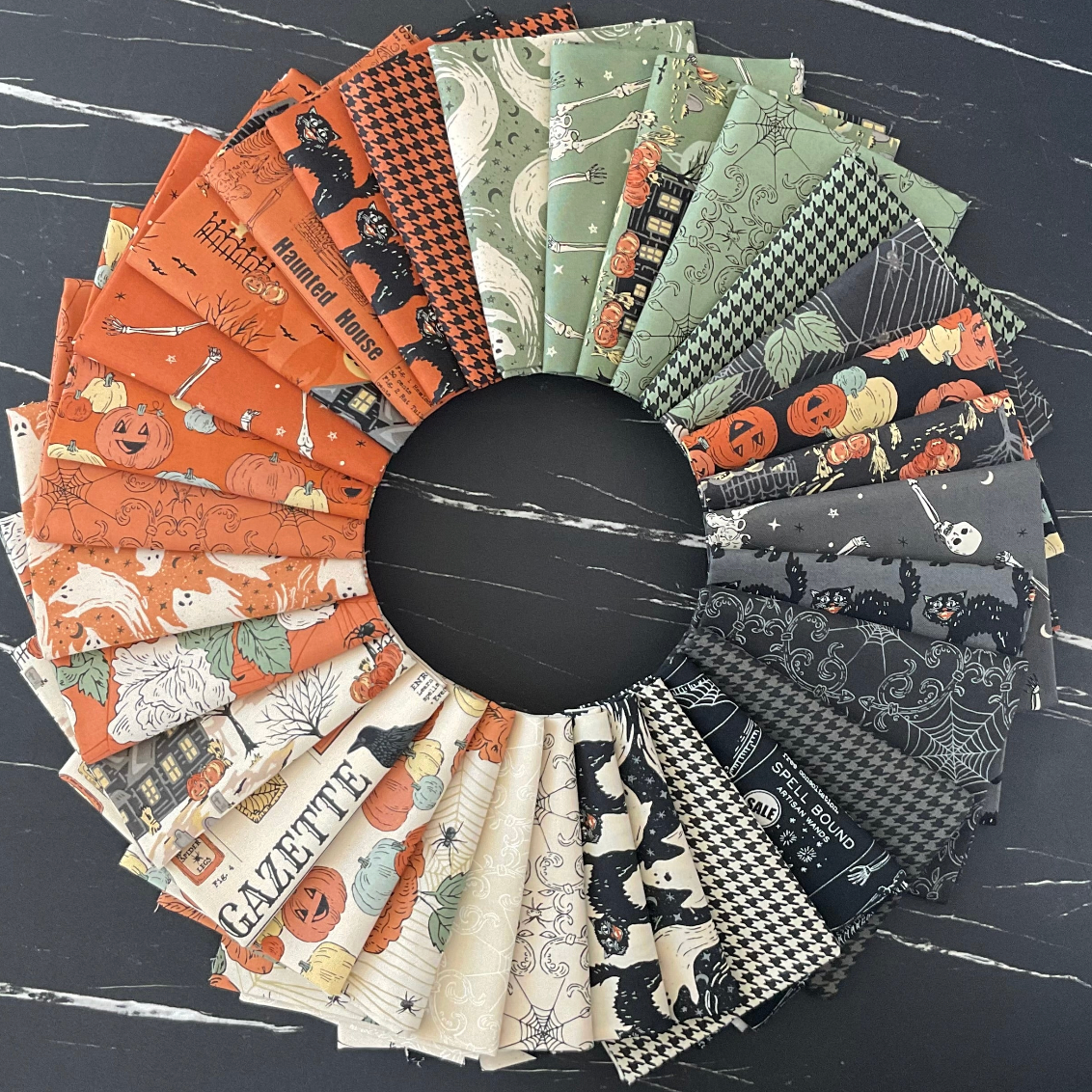 In addition to a wide range of prints and three perfectly spooky quilt patterns, Home Sweet Haunt has three sweet and spooky panels. A graphic nine square panel is perfect for quilt making as well as fun projects like pillows, bins and totes. A witch panel and skelly doll panel are fun to play with and also helps add a little spook to your home. Who needs candy when you have all these fun panels!