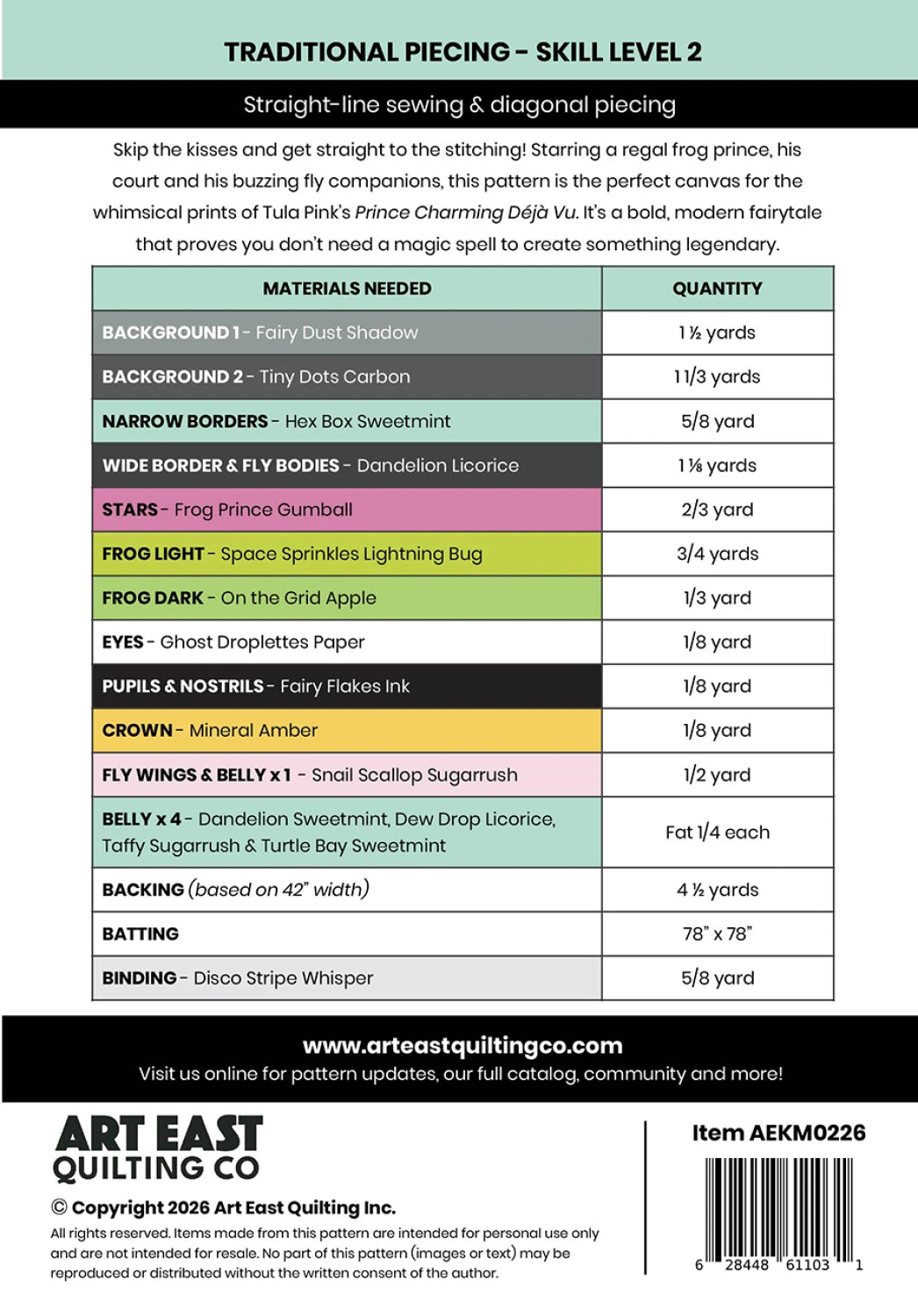 Leap into a Fairytale Without the Fuss Transform your sewing room into a vibrant, whimsical pond with this statement quilt. Measuring a generous 72" x 72", this pattern is designed to showcase the bold, kaleidoscopic artistry of Tula Pink’s Prince Charming Deja Vu and True Colors collections. Forget the traditional tropes—this is a modern fairytale where the frogs are happy just as they are. Join our charming cast of characters as they lounge under a canopy of geometric stars, keeping a watchful eye on the buzzing flies flitting through the reeds. Pattern Highlights: The Royal Resident: Features a signature "Prince" frog block—regal, green, and perfectly content without a single kiss. Celestial Sparkle: Uses star blocks to showcase a large-scale hero print. A Touch of Whimsy: Playful fly motifs add a dash of humor and detail to the pond-side scene. Showcase Scale: Specifically designed to handle the large-scale prints and vivid hues that define the Tula Pink aesthetic. Whether you are a seasoned quilter looking for your next masterpiece or a Tula Pink enthusiast ready to dive into your stash, this pattern offers a fun, narrative journey from the first snip to the final binding. No magic spells or true love’s kisses required—just your sewing machine and a sense of adventure.
