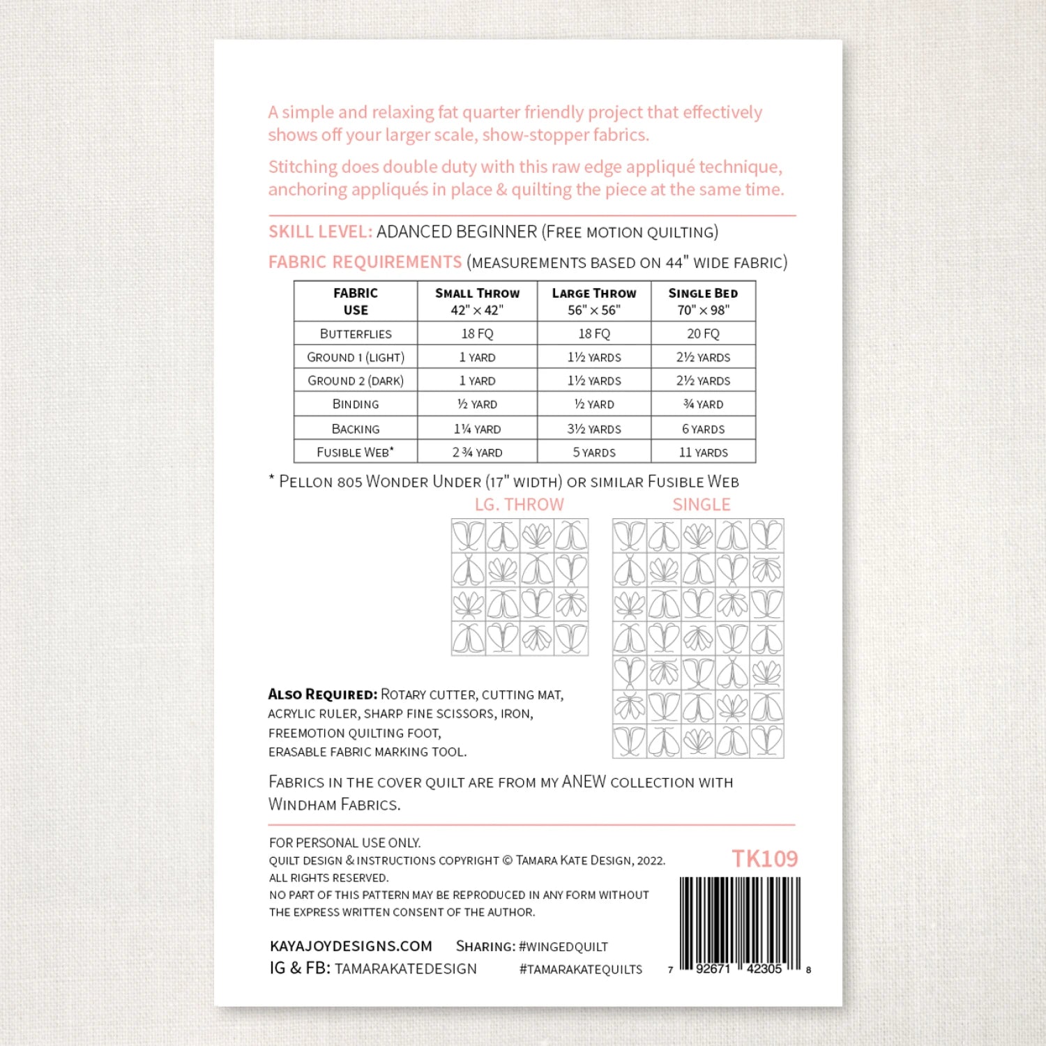 Winged Appliqué Quilt Pattern (paper version). Finished Size: Small Throw (42" x 42"); Large Throw (56" x 56"); Single Bed (70" x 98"). Skill Level: Advanced Beginner (free motion quilting) A simple and relaxing fat quarter friendly project that effectively shows off your larger scale, show stopper fabrics. Stitching does double duty with this raw edge appliqué technique, anchoring appliqués in place and quilting the piece at the same time. Includes: Full sized templates, instructions, diagrams, layout diagram for easy template placement, fabric requirement list.