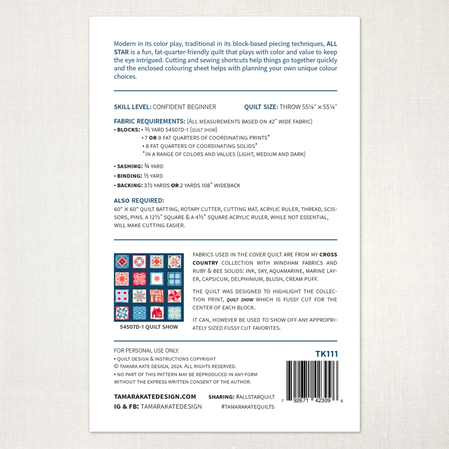 Finished Size: Throw (55" x 55") Skill Level: Confident Beginner Modern in its color play, traditional in its block-based piecing techniques, ALL STAR is a fun, fat-quarter-friendly quilt that plays with color and value to keep the eye intrigued. Cutting and sewing shortcuts help things go together quickly and the enclosed colouring sheet helps with planning your own unique colour choices. Includes: Instructions, diagrams, colouring sheet, fabric requirement list.