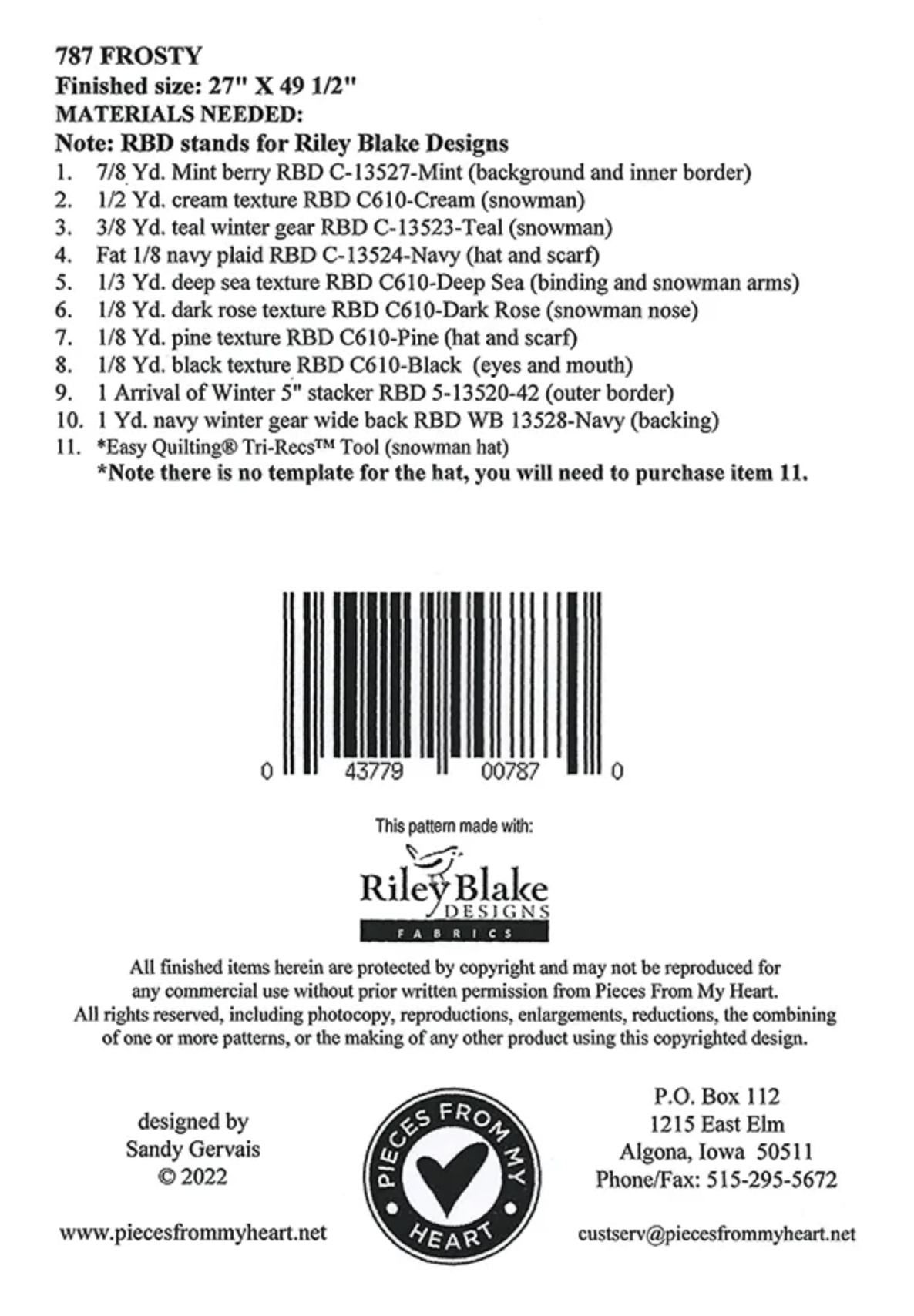 Item Description: The Frosty Wall Hanging by Sandy Gervais of Pieces from My Heart features happy little snowman has snowflake blocks for the bottom two bumps of his body. A 5" stacker is used to make the pieced border, so no cutting there! Finished size is 27" x 49 1/2".