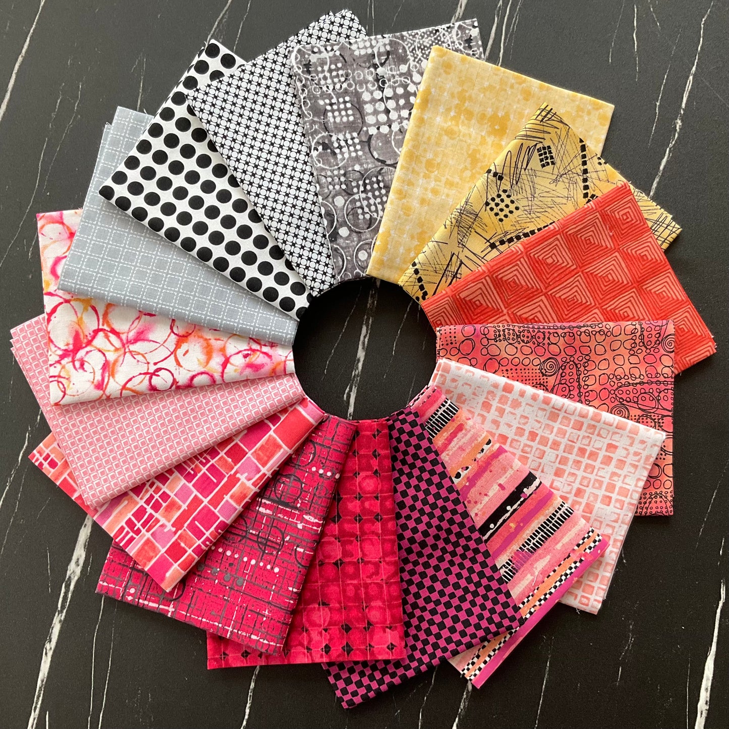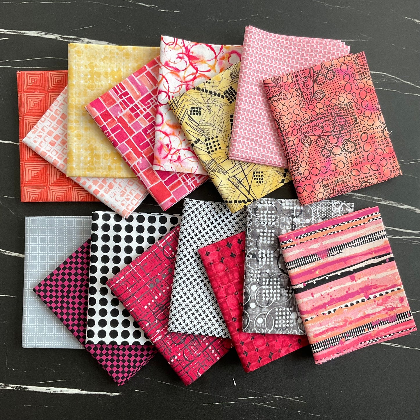 Hot, hot colors! It is a heat wave! There are lights and darks to give a full value range. Lights add illumination to a quilt, while the darks add depth, and the mediums in this collection add ‘the heat’. I love the way that black and white prints add a special zing to quilts, so of course, I have a few of these for you as well. Tone on tones are my favorite type of print to use because they work like solids, but have so much personality and add energy to the quilt. Enjoy playing with these hot colors.