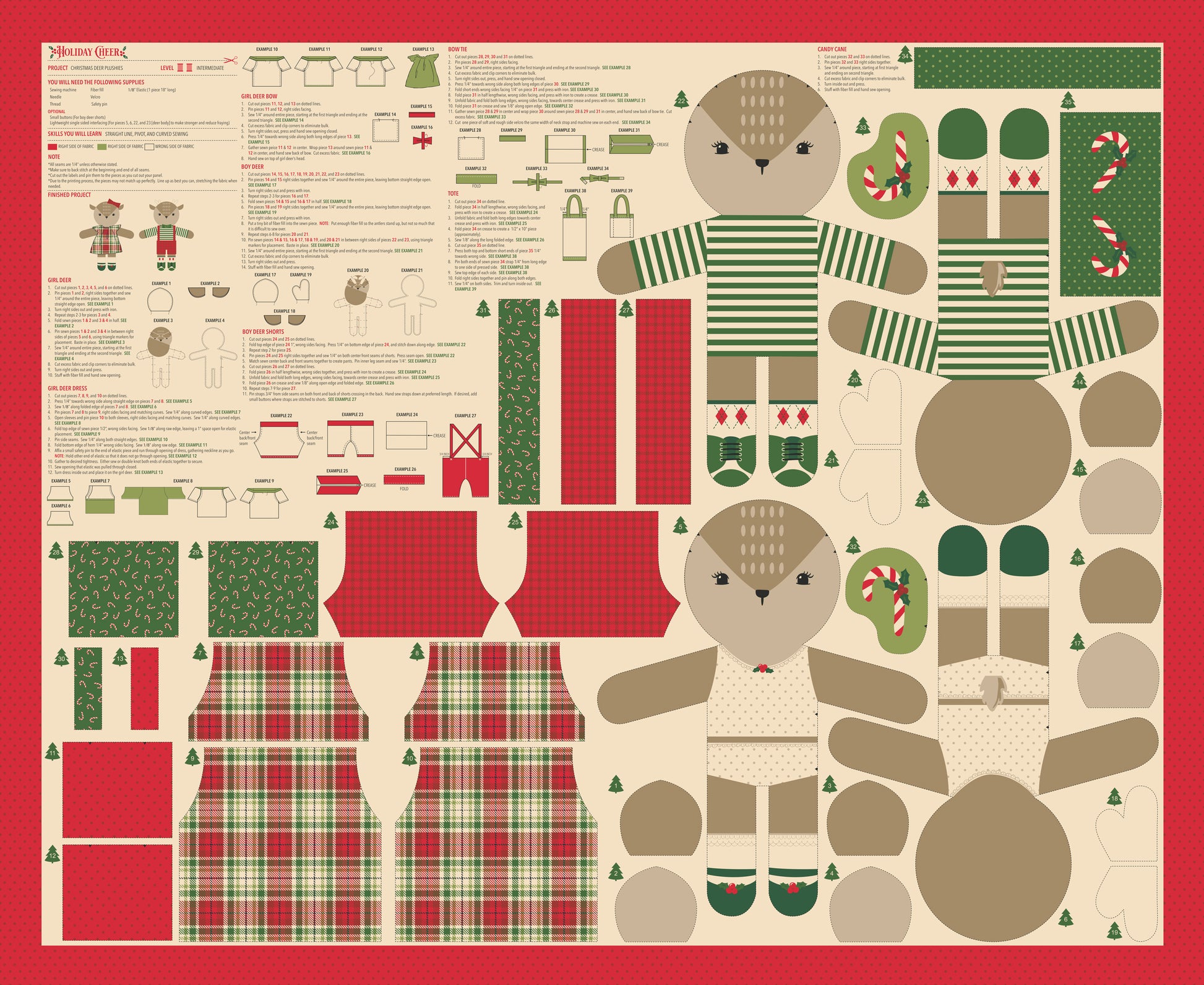 Holiday Cheer is a nostalgic nod to Christmases past. With its traditional colors and vintage-inspired prints, this collection is sure to bring just the right amount of holiday spirit to your next project. The prints feature classic holiday motifs such as candy canes, wreaths, poinsettias, and plaids, along with a charming vintage newsletter design that offers a whimsical peek into daily life at the North Pole during the festive season. You’ll even discover the perfect cookie recipe from Mrs. Claus herself! The collection also includes two delightful panels—one featuring classic Christmas imagery and sayings, and the other showcasing an adorable pair of reindeer dressed for the holidays. Five quilts have been designed specifically for this collection, each beautifully highlighting the timeless holiday prints. With patterns suitable for all skill levels, from beginner to advanced, there’s something for everyone. Ring in the holiday season with a touch of vintage charm, a hint of tradition, and an abundance of Christmas spirit—with Holiday Cheer.