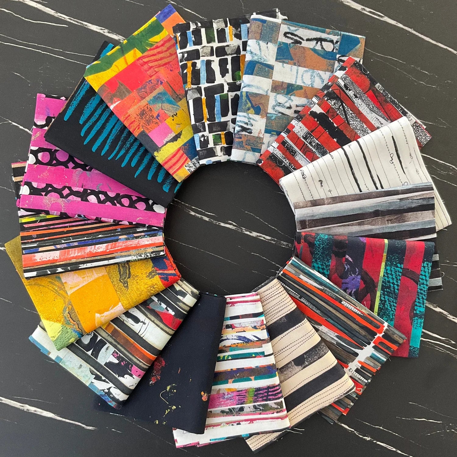 LINEAGE is the collection that arrived after spending a summer making lines and playing around with the question, ‘When does a line become a stripe?’ The patterns that resulted from those explorations became a diverse compilation of drawings and collages, reveling in the beauty of a line, whether it be simple or complex. Then, thinking about the infinite ways those individual lines could evolve into stripes. During the making of the collection, I came to appreciate that one line alone can’t be a good stripe. Stripes by their very nature are pieces gathered, like families, standing side by side, making and taking up space together in a community. This collection is also a promise fulfilled to my cousin Sarah, an amazing quilter and the ultimate lover of stripes. Years ago, she asked me to create a stripe pattern, and from that one ask LINEAGE was born. To Sarah and stripe lovers everywhere, this is for you.