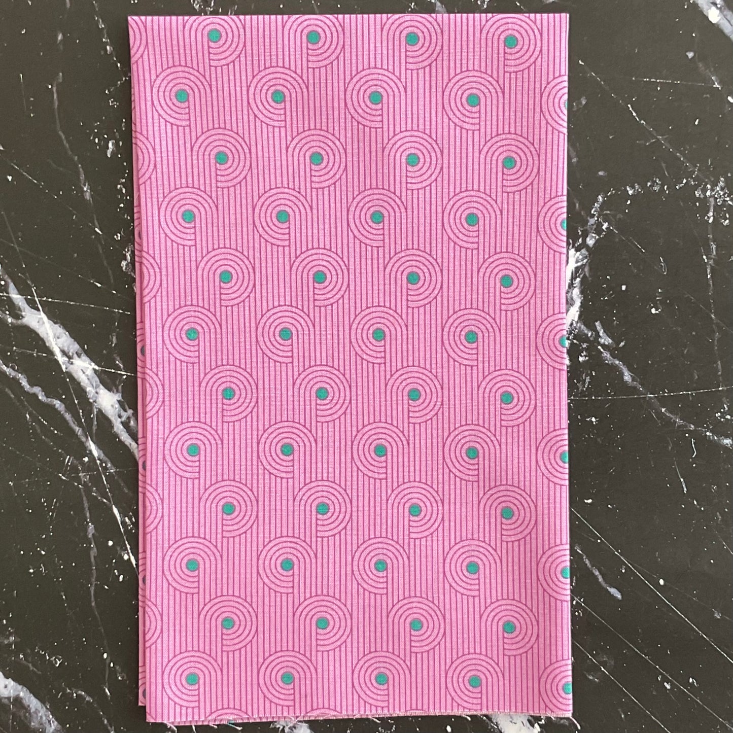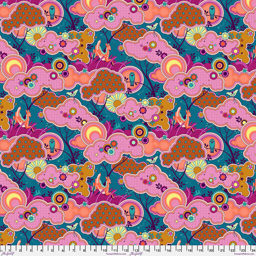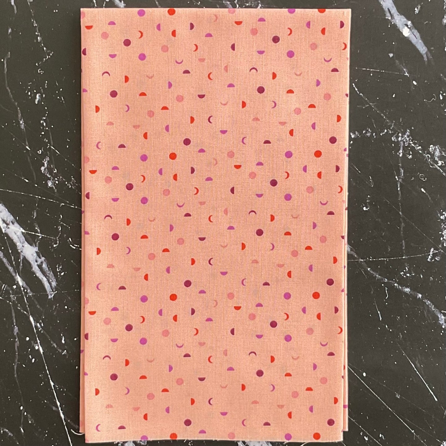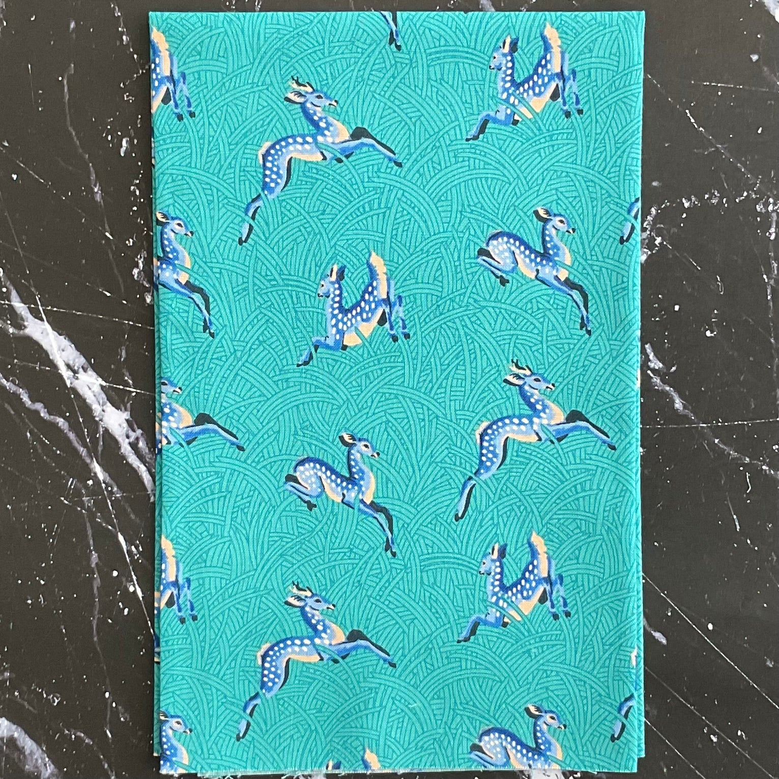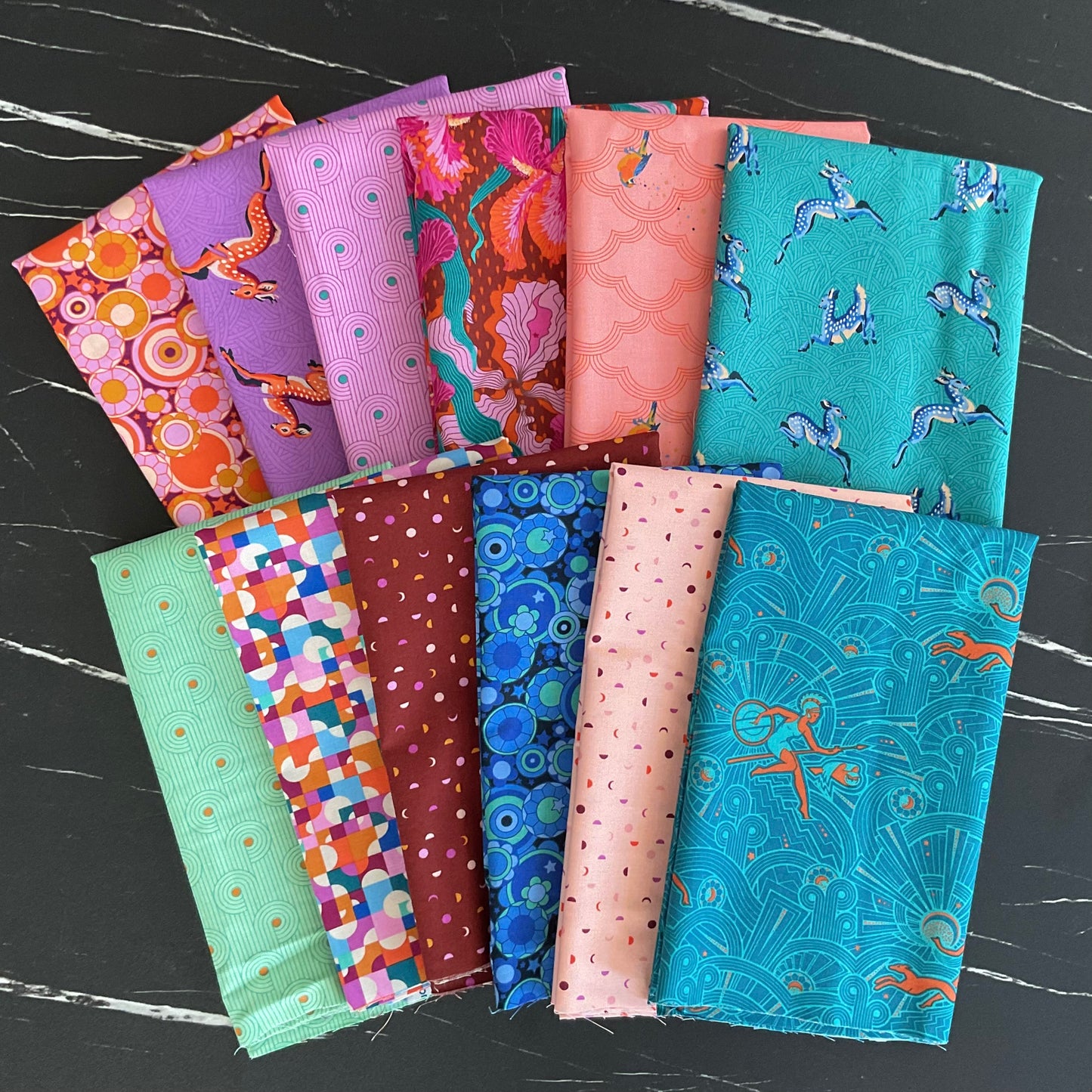 The “Mythical” collection is a fantastical glimpse into a fierce group of goddesses from ancient Greek folklore. They ruled over much of the ancient world and had the ability to transform into animal form. “Fabled Forest” is their domain, and it exists somewhere on the horizon where the moon and the meadows collide in a stylized realm, mystical animals roam and the trees are made of stars. In the pattern “Powerhouse,” shimmering sunbursts and moon rays explode with zigzags and shockwaves to demonstrate the fierce power and protection of Athena and Artemis. If you look carefully along the riverbanks, the goddess “Iris” can be found among the exotic flowers that bear her name. Animals are scattered within the collection. Among the clouds and stars, in a peach-colored sky, a “Nightingale” sings and deer scatter across a “Wild Meadow” of fluttering grass. In “Owl See You,” an owl quietly sees all and blends beautifully with the other patterns. Multi-colored squares and half-moons evoke a multi-dimensional universe in “Dawn.” Punched-out moon phases feel like confetti in “It’s A Phase.” Linear lines lend movement in “Fiddlehead,” and blooms and bullseyes give off good vibes in “Bloom.”