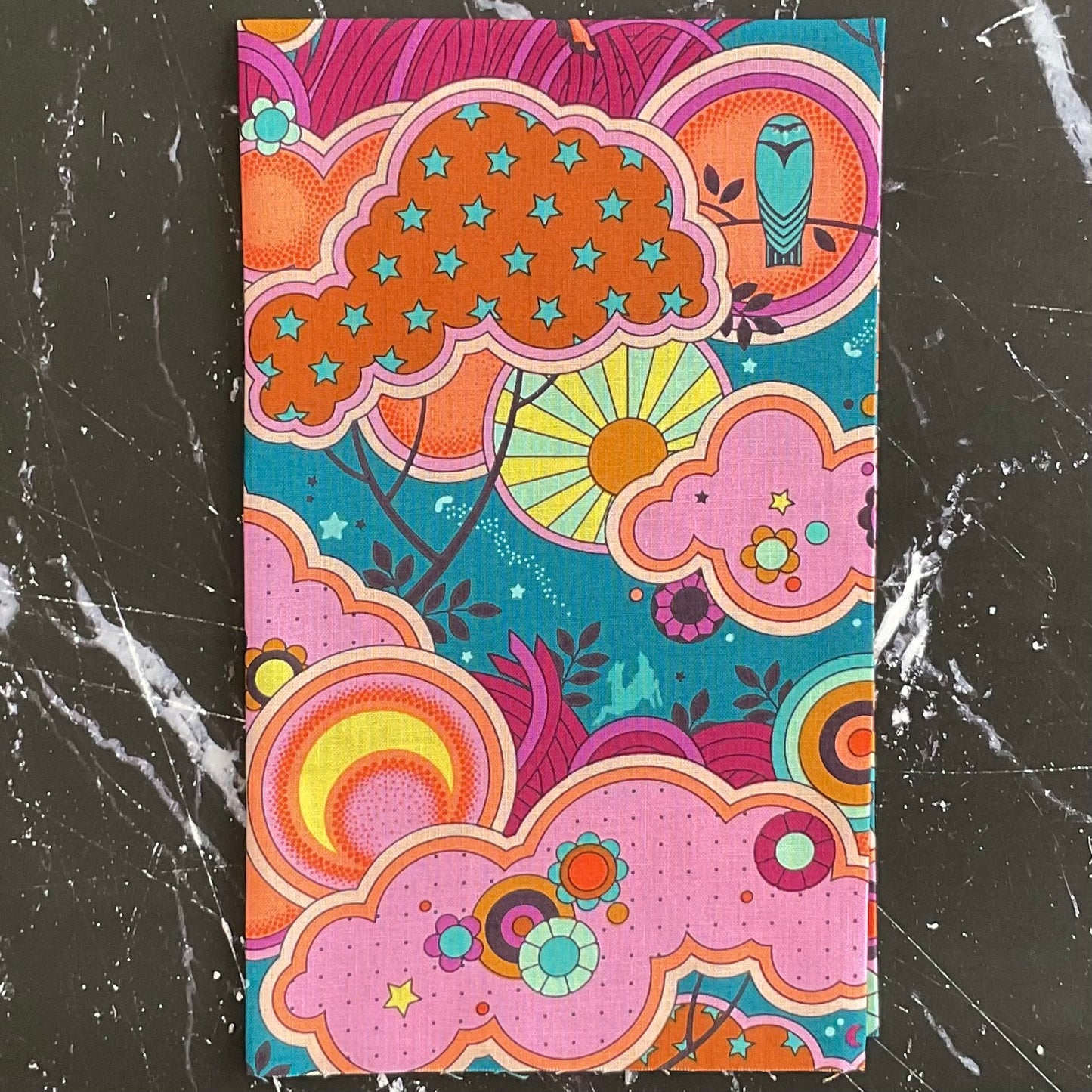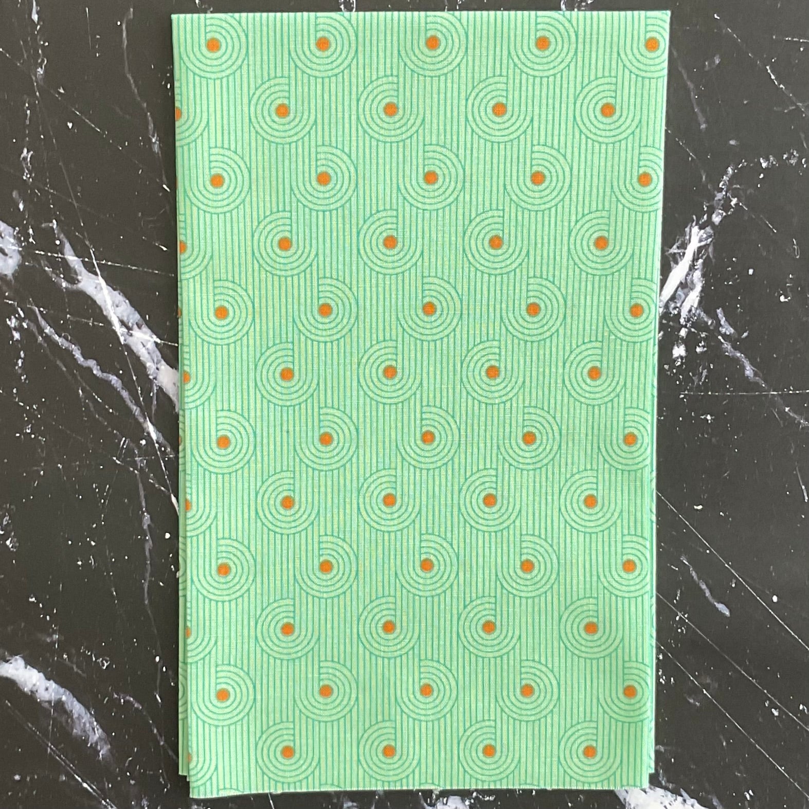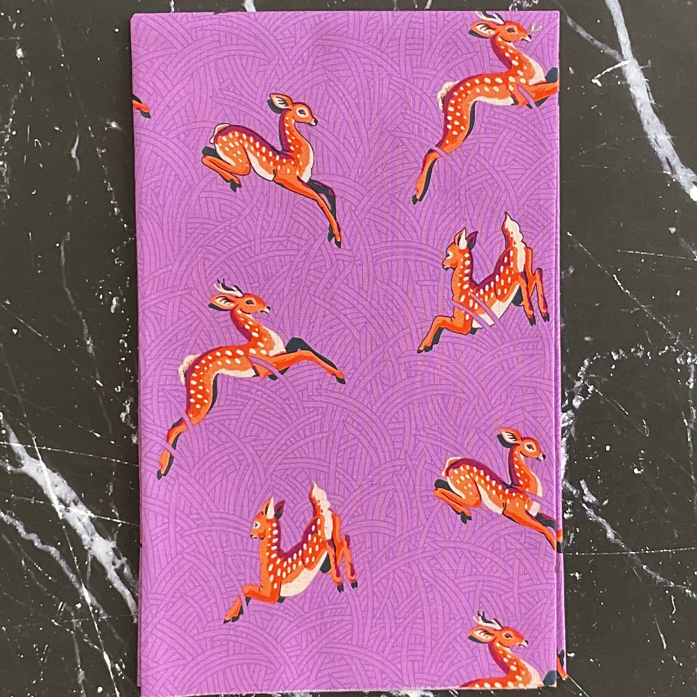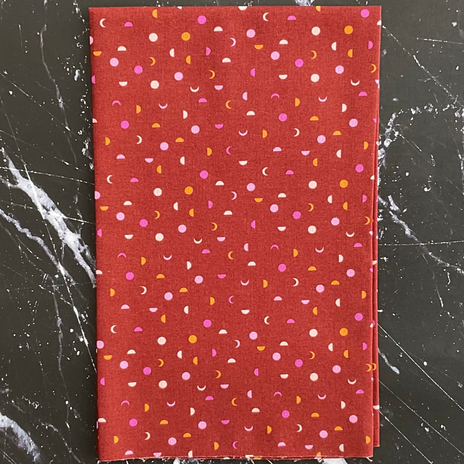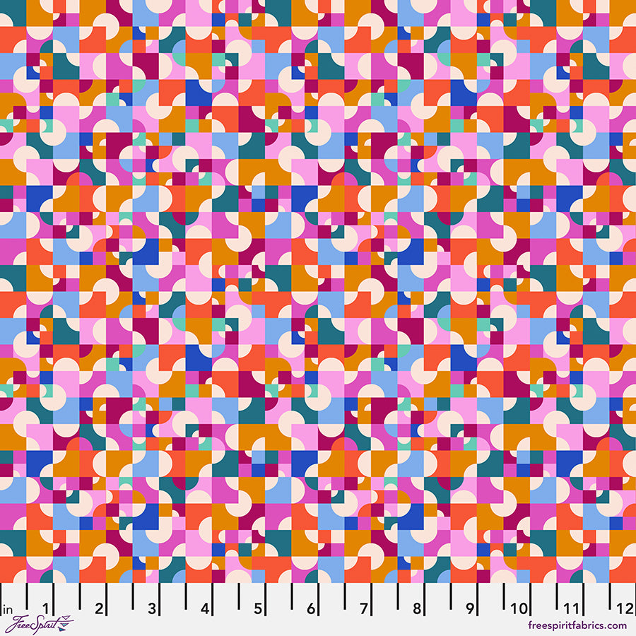 The “Mythical” collection is a fantastical glimpse into a fierce group of goddesses from ancient Greek folklore. They ruled over much of the ancient world and had the ability to transform into animal form. “Fabled Forest” is their domain, and it exists somewhere on the horizon where the moon and the meadows collide in a stylized realm, mystical animals roam and the trees are made of stars. In the pattern “Powerhouse,” shimmering sunbursts and moon rays explode with zigzags and shockwaves to demonstrate the fierce power and protection of Athena and Artemis. If you look carefully along the riverbanks, the goddess “Iris” can be found among the exotic flowers that bear her name. Animals are scattered within the collection. Among the clouds and stars, in a peach-colored sky, a “Nightingale” sings and deer scatter across a “Wild Meadow” of fluttering grass. In “Owl See You,” an owl quietly sees all and blends beautifully with the other patterns. Multi-colored squares and half-moons evoke a multi-dimensional universe in “Dawn.” Punched-out moon phases feel like confetti in “It’s A Phase.” Linear lines lend movement in “Fiddlehead,” and blooms and bullseyes give off good vibes in “Bloom.”