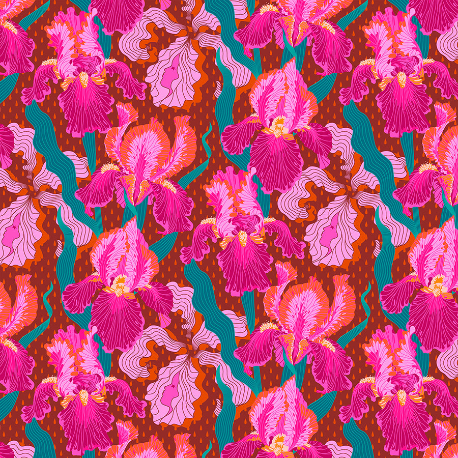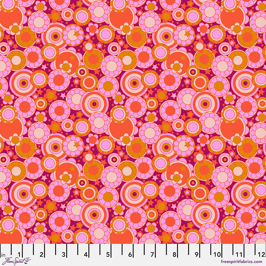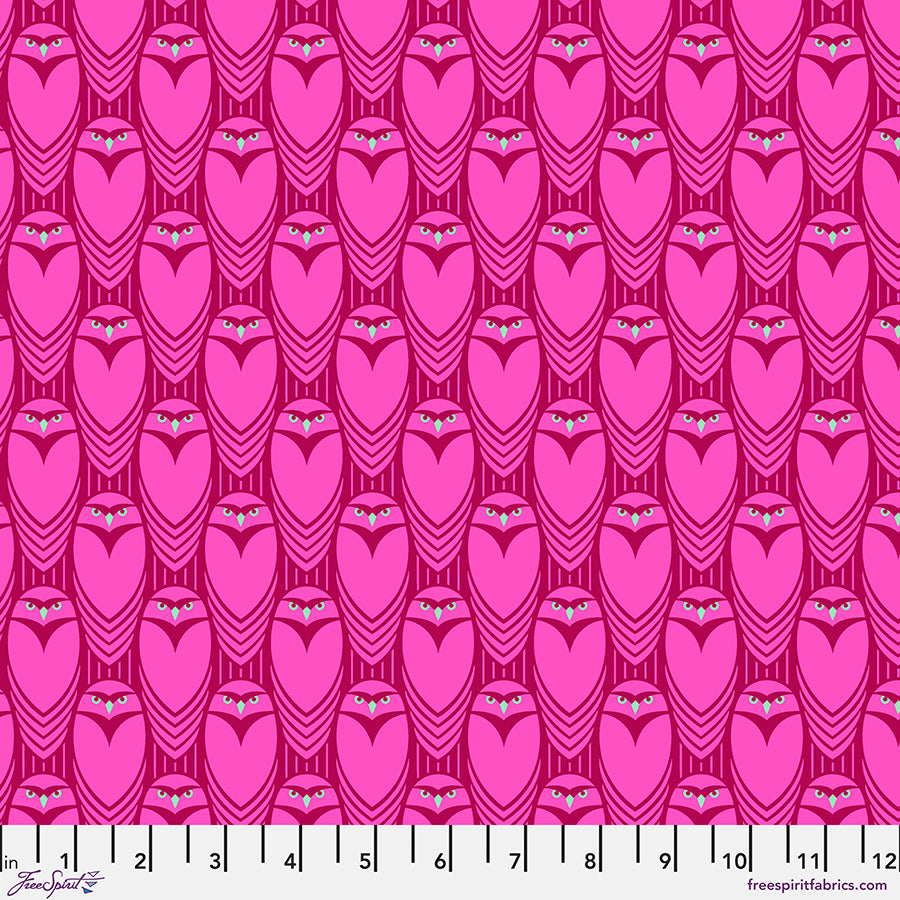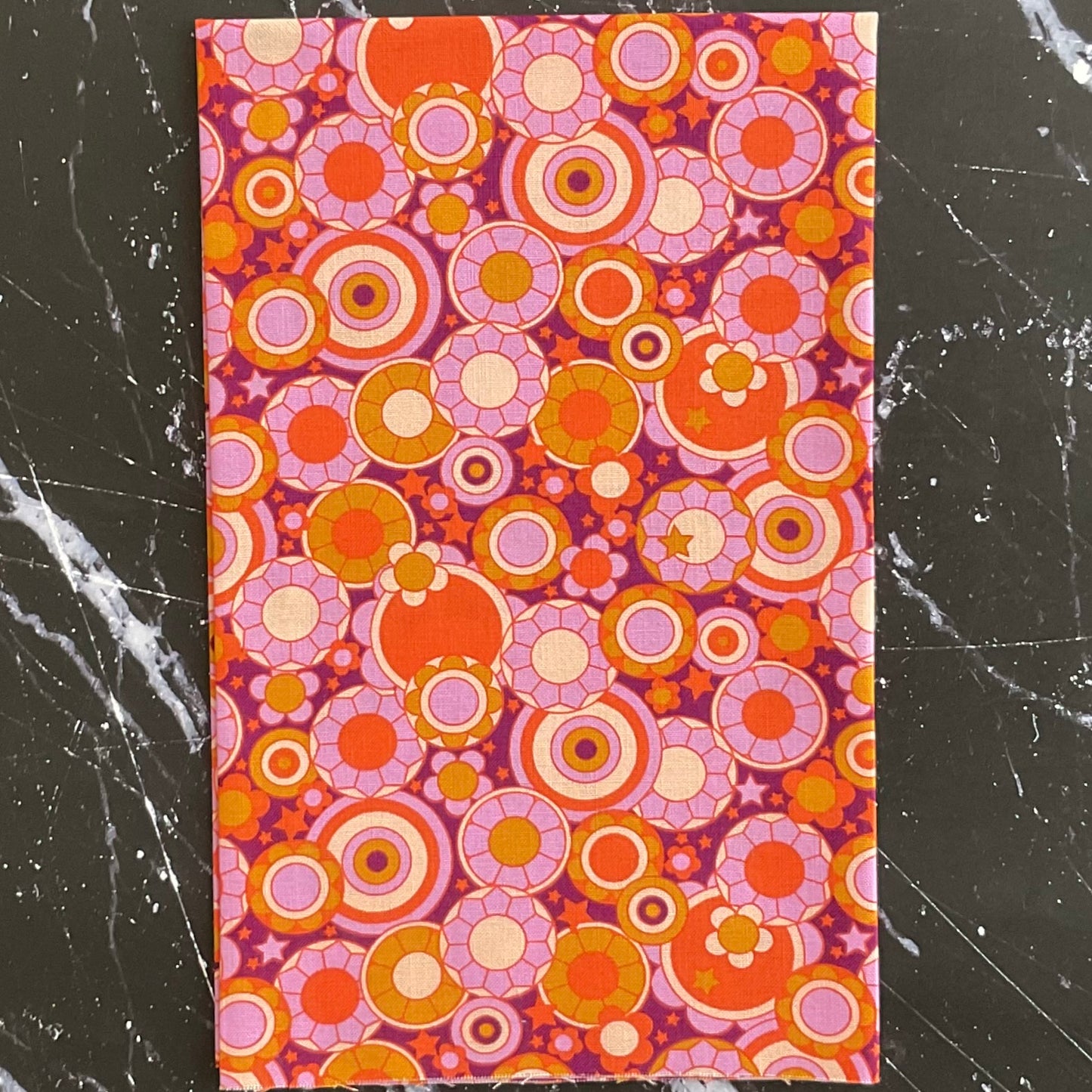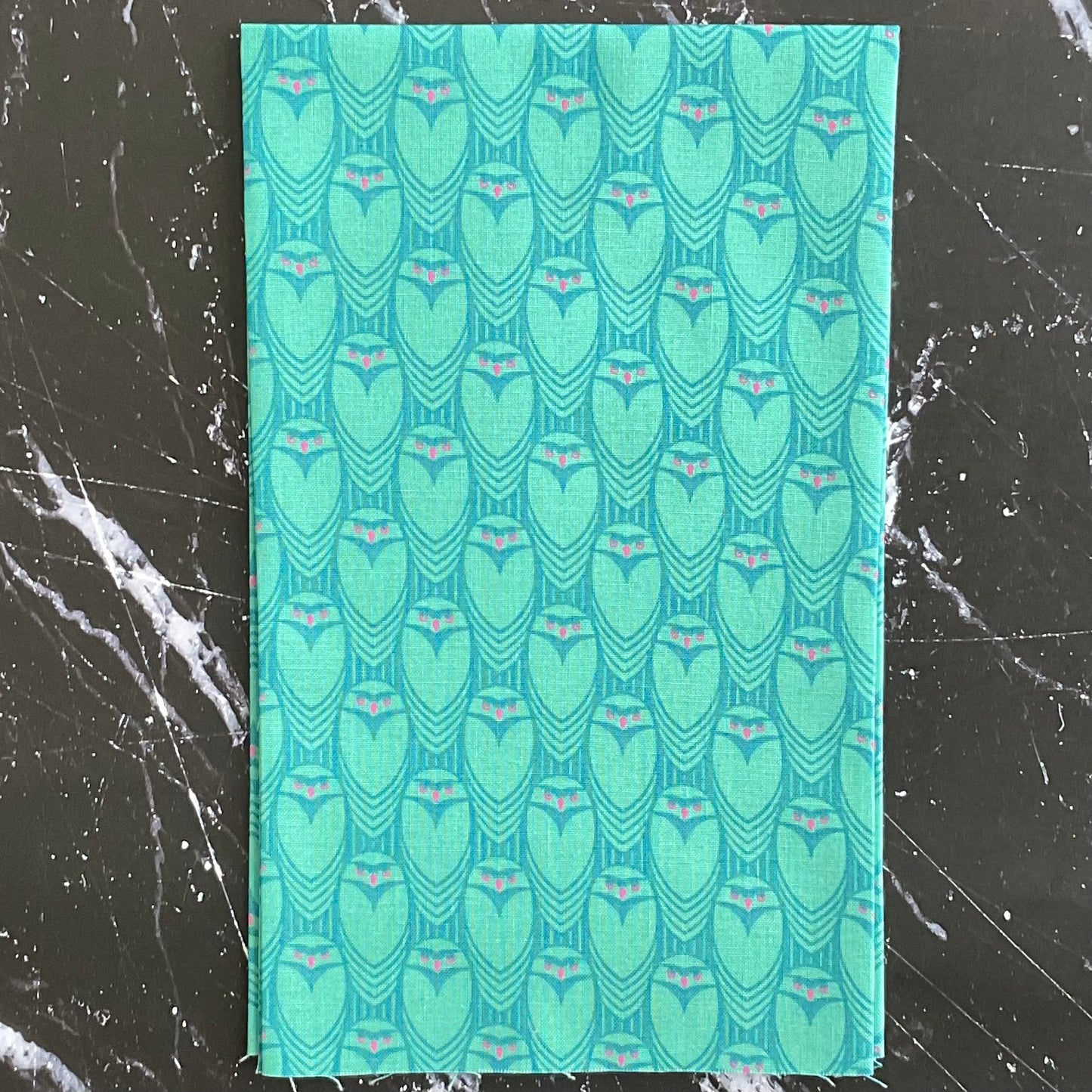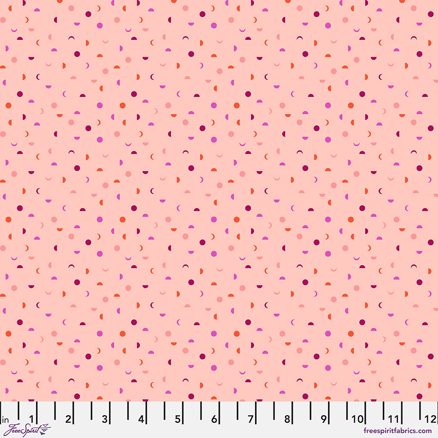 The “Mythical” collection is a fantastical glimpse into a fierce group of goddesses from ancient Greek folklore. They ruled over much of the ancient world and had the ability to transform into animal form. “Fabled Forest” is their domain, and it exists somewhere on the horizon where the moon and the meadows collide in a stylized realm, mystical animals roam and the trees are made of stars. In the pattern “Powerhouse,” shimmering sunbursts and moon rays explode with zigzags and shockwaves to demonstrate the fierce power and protection of Athena and Artemis. If you look carefully along the riverbanks, the goddess “Iris” can be found among the exotic flowers that bear her name. Animals are scattered within the collection. Among the clouds and stars, in a peach-colored sky, a “Nightingale” sings and deer scatter across a “Wild Meadow” of fluttering grass. In “Owl See You,” an owl quietly sees all and blends beautifully with the other patterns. Multi-colored squares and half-moons evoke a multi-dimensional universe in “Dawn.” Punched-out moon phases feel like confetti in “It’s A Phase.” Linear lines lend movement in “Fiddlehead,” and blooms and bullseyes give off good vibes in “Bloom.”