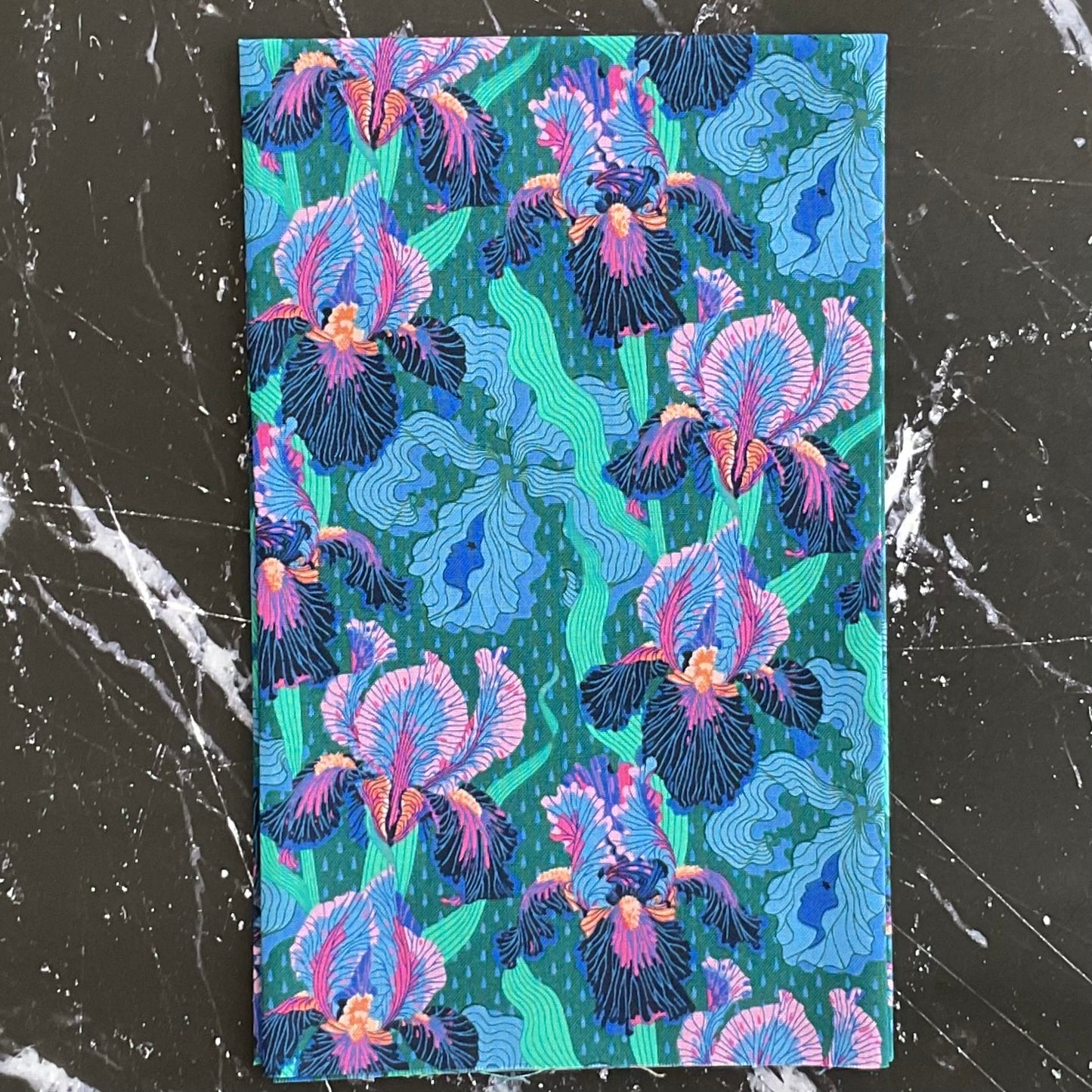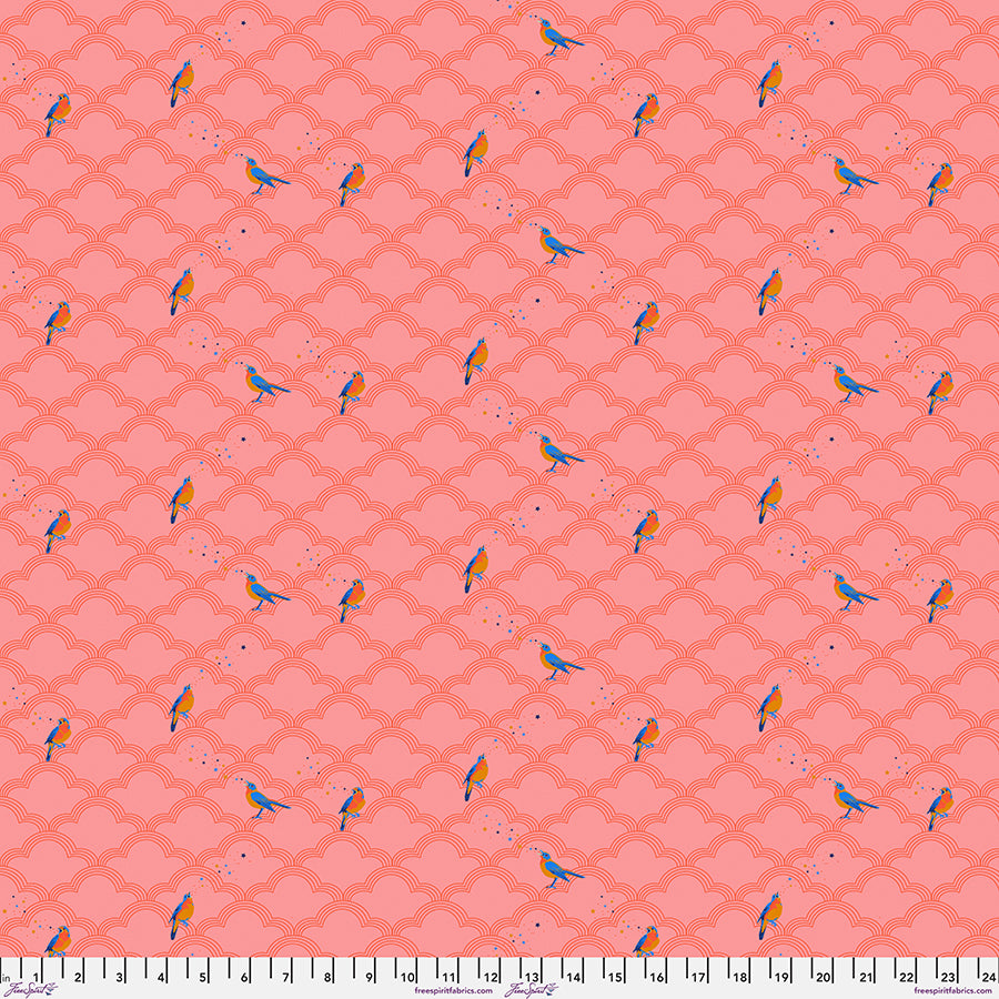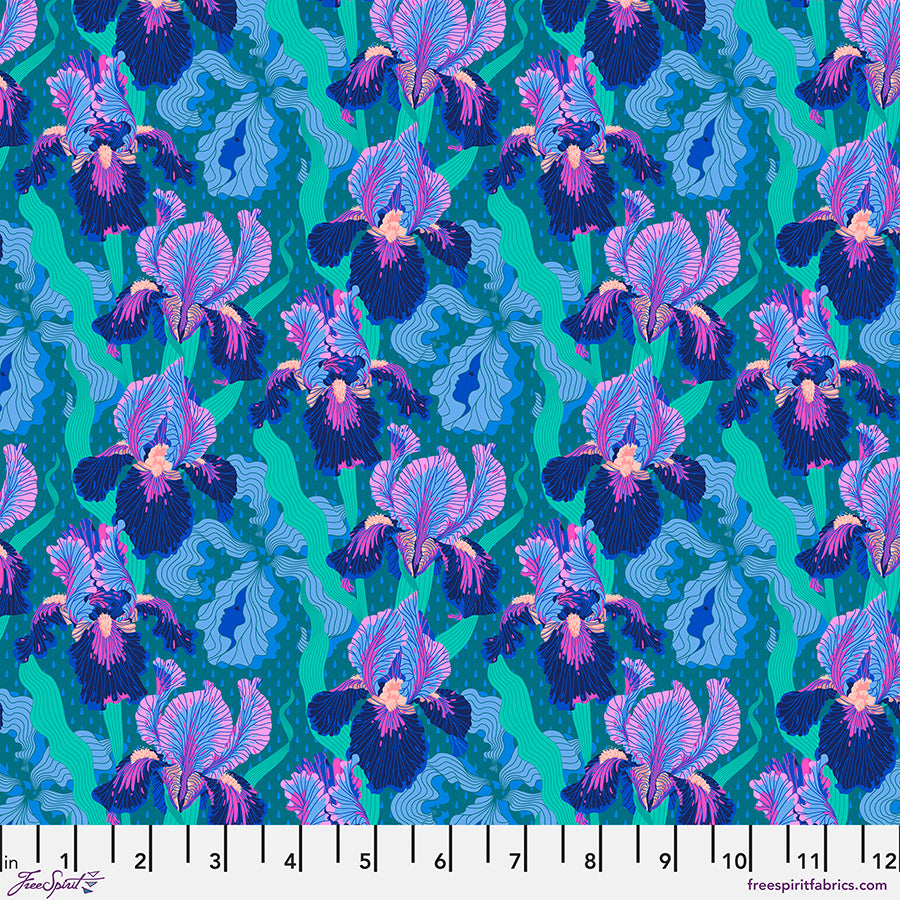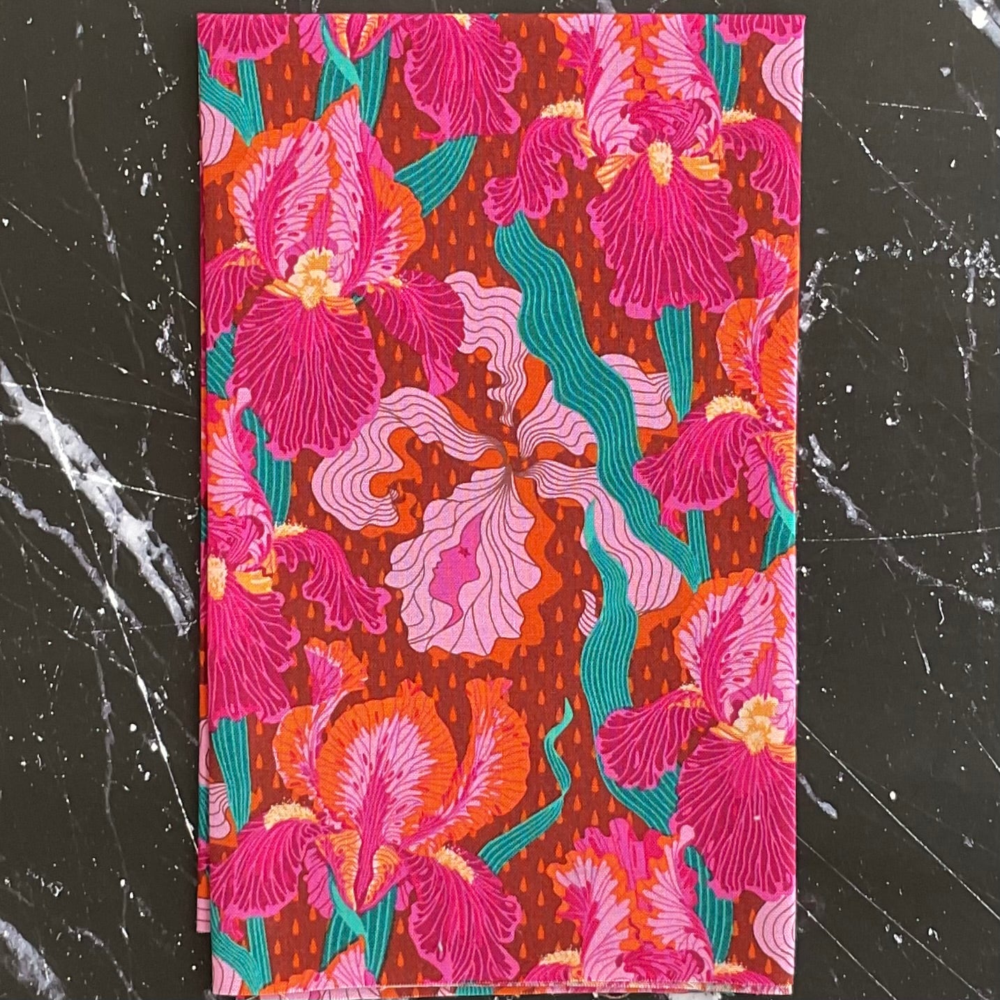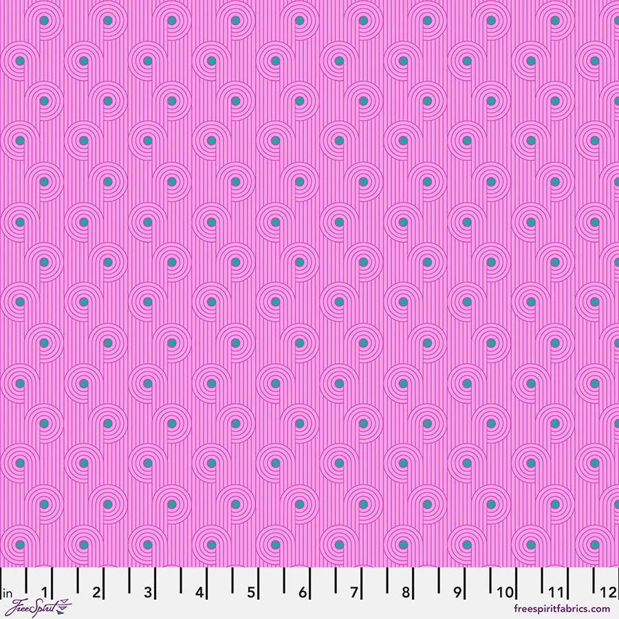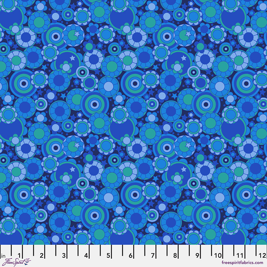 The “Mythical” collection is a fantastical glimpse into a fierce group of goddesses from ancient Greek folklore. They ruled over much of the ancient world and had the ability to transform into animal form. “Fabled Forest” is their domain, and it exists somewhere on the horizon where the moon and the meadows collide in a stylized realm, mystical animals roam and the trees are made of stars. In the pattern “Powerhouse,” shimmering sunbursts and moon rays explode with zigzags and shockwaves to demonstrate the fierce power and protection of Athena and Artemis. If you look carefully along the riverbanks, the goddess “Iris” can be found among the exotic flowers that bear her name. Animals are scattered within the collection. Among the clouds and stars, in a peach-colored sky, a “Nightingale” sings and deer scatter across a “Wild Meadow” of fluttering grass. In “Owl See You,” an owl quietly sees all and blends beautifully with the other patterns. Multi-colored squares and half-moons evoke a multi-dimensional universe in “Dawn.” Punched-out moon phases feel like confetti in “It’s A Phase.” Linear lines lend movement in “Fiddlehead,” and blooms and bullseyes give off good vibes in “Bloom.”