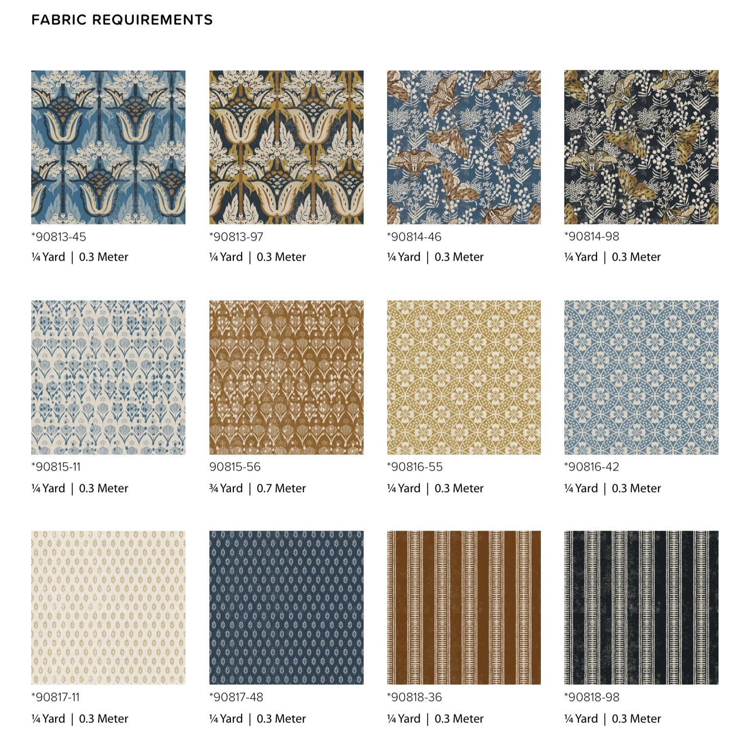 A Japanese-inspired collection with the term 'Wabi Sabi' in mind, valuing beauty that is imperfect. Much like one values an old, rustic, homespun quilt that's been passed down the family line and treasured in its austerity. Wabi takes you on a journey into new and old motifs with a rich color palette of golds, blues, browns and blacks. This collection is sure to be treasured throughout every generation with its roughened, faded patina and timeless prints.