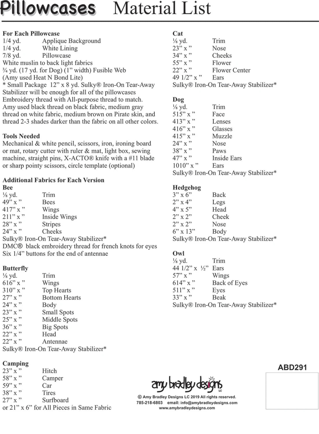 Pillowcases Pattern includes full size patterns, full size placement sheets, and instructions to make Twelve 20 1/4" x 31 1/2" Pillowcases. The twelve are Hedgehog, Whale, Submarine, Tractor, Owl, Cat, Camper, Bee, Dog, Pirate, Panda, and Butterfly. The technique is fusible applique.