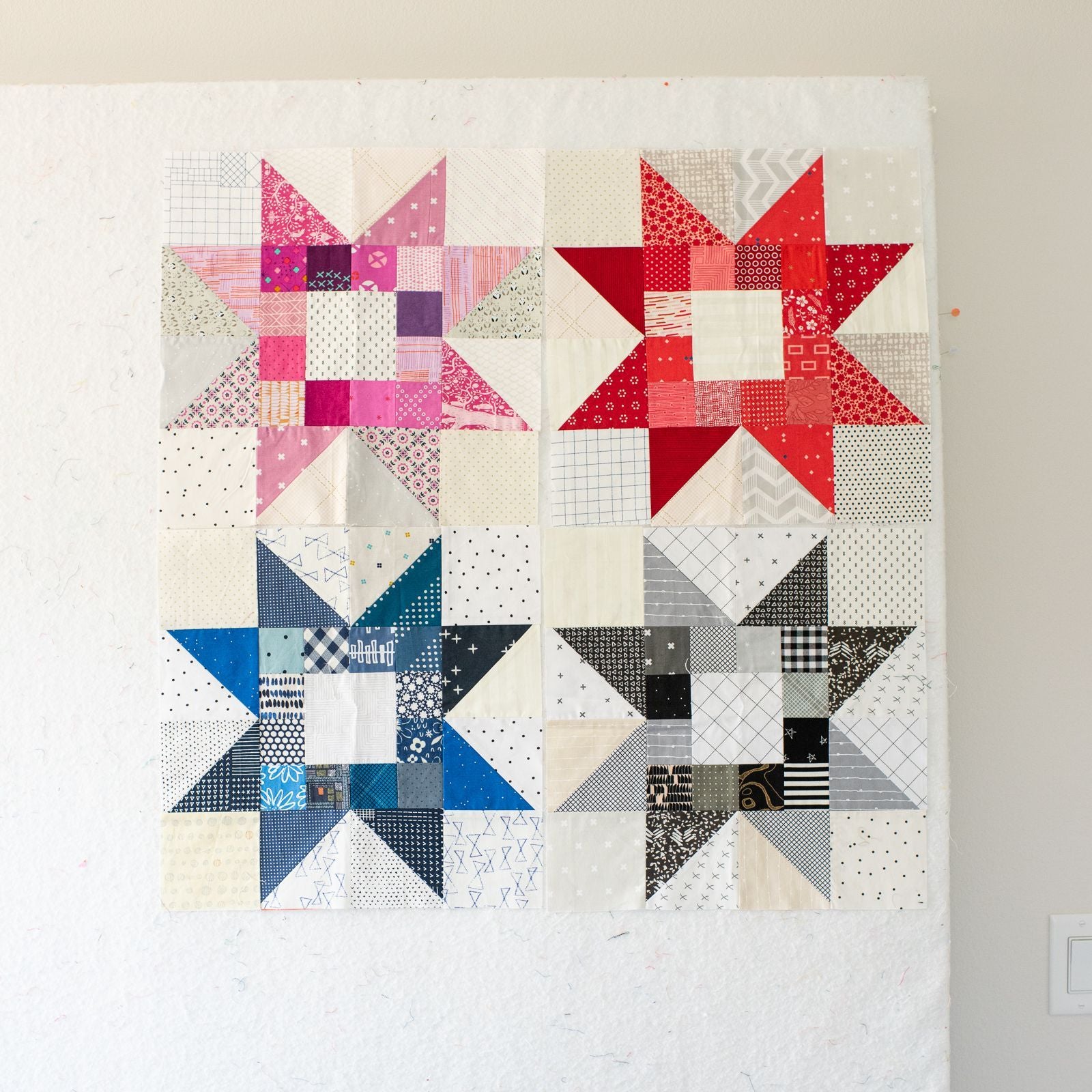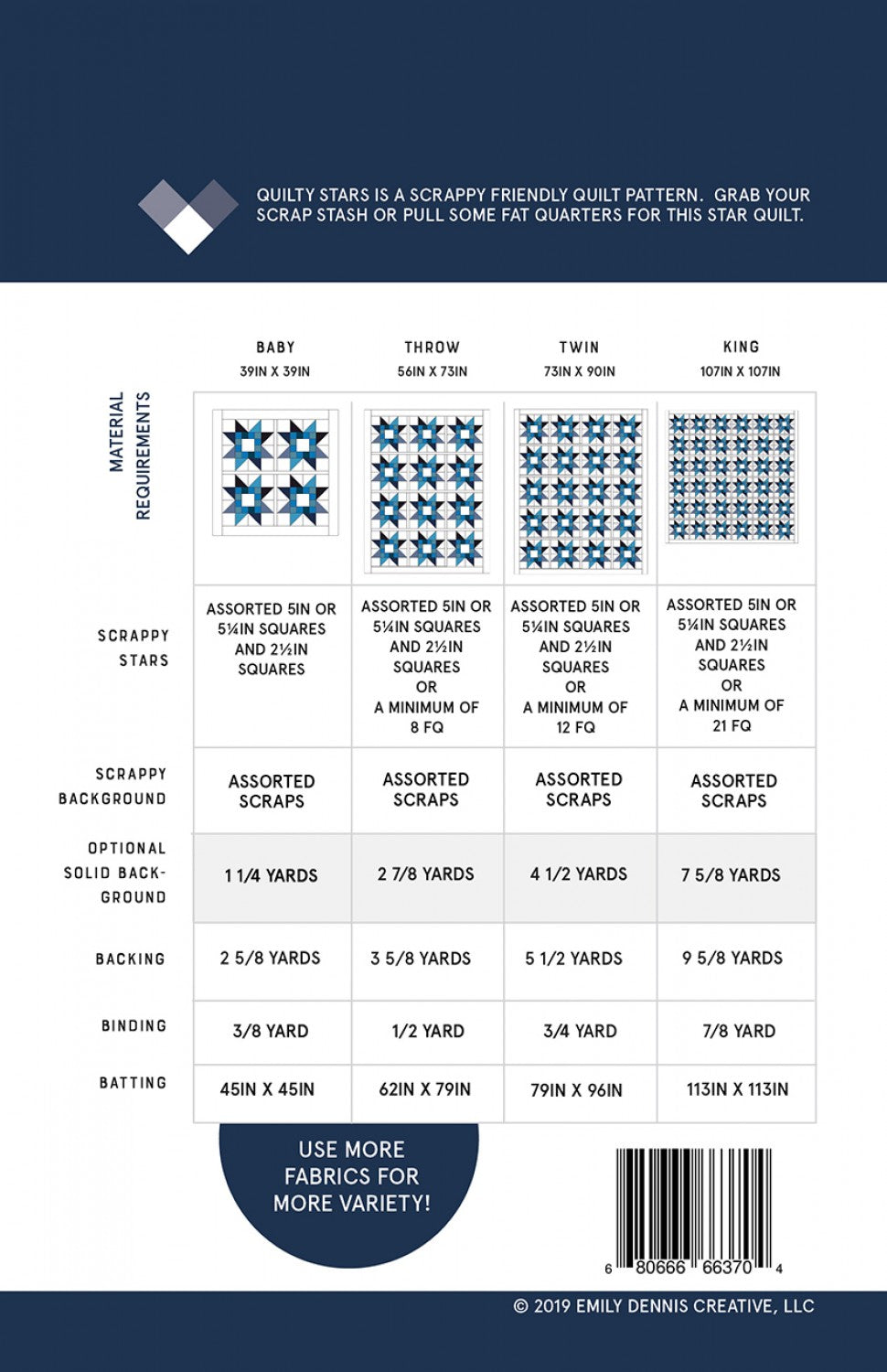 Scrappy friendly quilt pattern! Use scraps or your fabric stash for this scrappy star quilt pattern. Instructions included for both a solid background and a full scrappy background. Use scraps, charm squares, fat quarters or fat eighths. Instructions included to make an baby size, throw size, twin size and king size quilt.