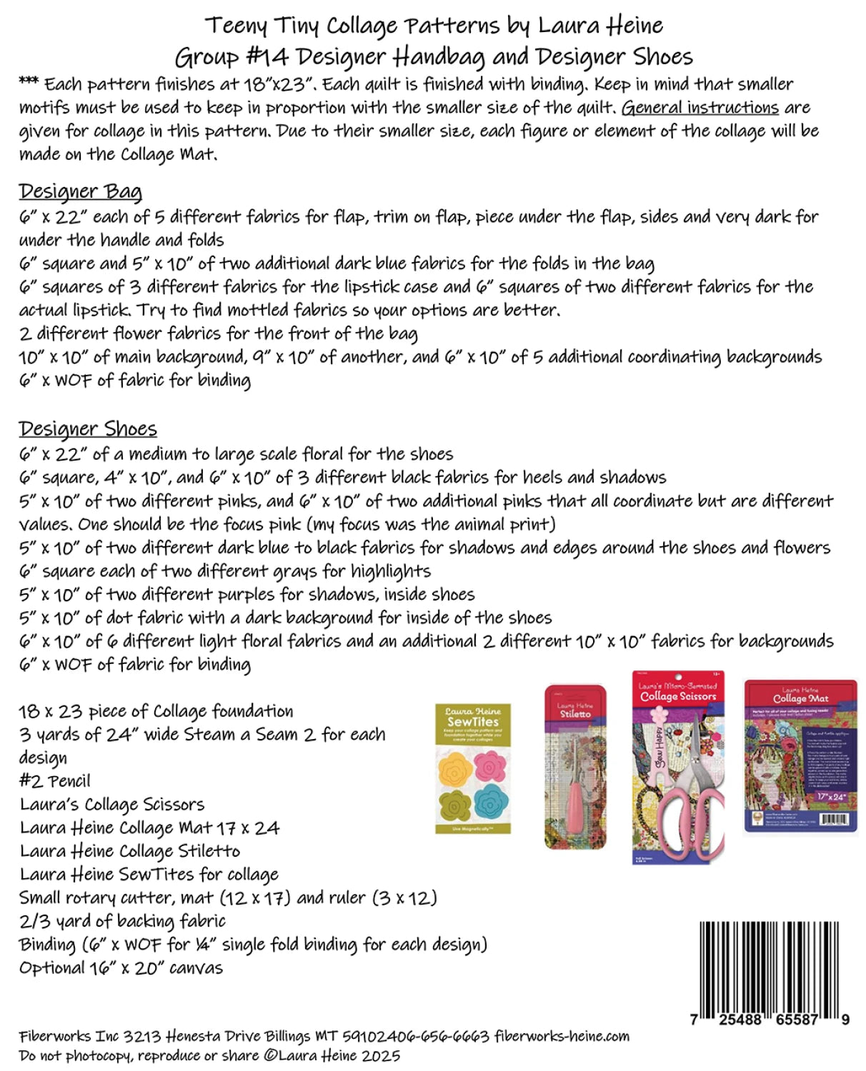 Teeny Tiny Collage Pattern Group #14 Designer Bag and Designer Shoes by Laura Heine. The perfect collage for your sewing room or your teenagers room. This fun collage can be finished with binding and hung on a wall or stretched on a canvas frame. Step by step color and full size instructions included for all three patterns Finished size 18x23.