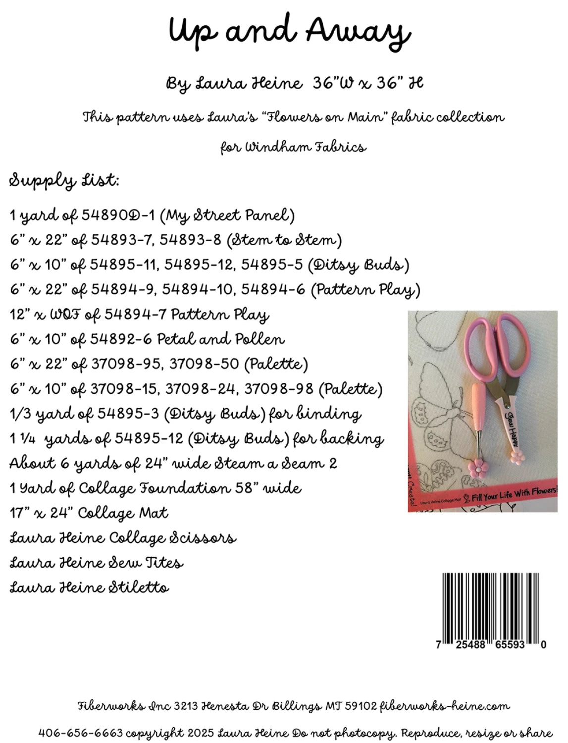 Up and Away Collage Pattern by Laura Heine. Up and Away transports you too a magical neighborhood with a beautiful skyline and colorful hot air balloons, where you want to spend time with your loved ones. This includes complete instructions, pictures and a full size pattern. This quilt is made from Laura's "Flowers on Main" fabric collection for Windham Fabrics. Finished size 36"x36"